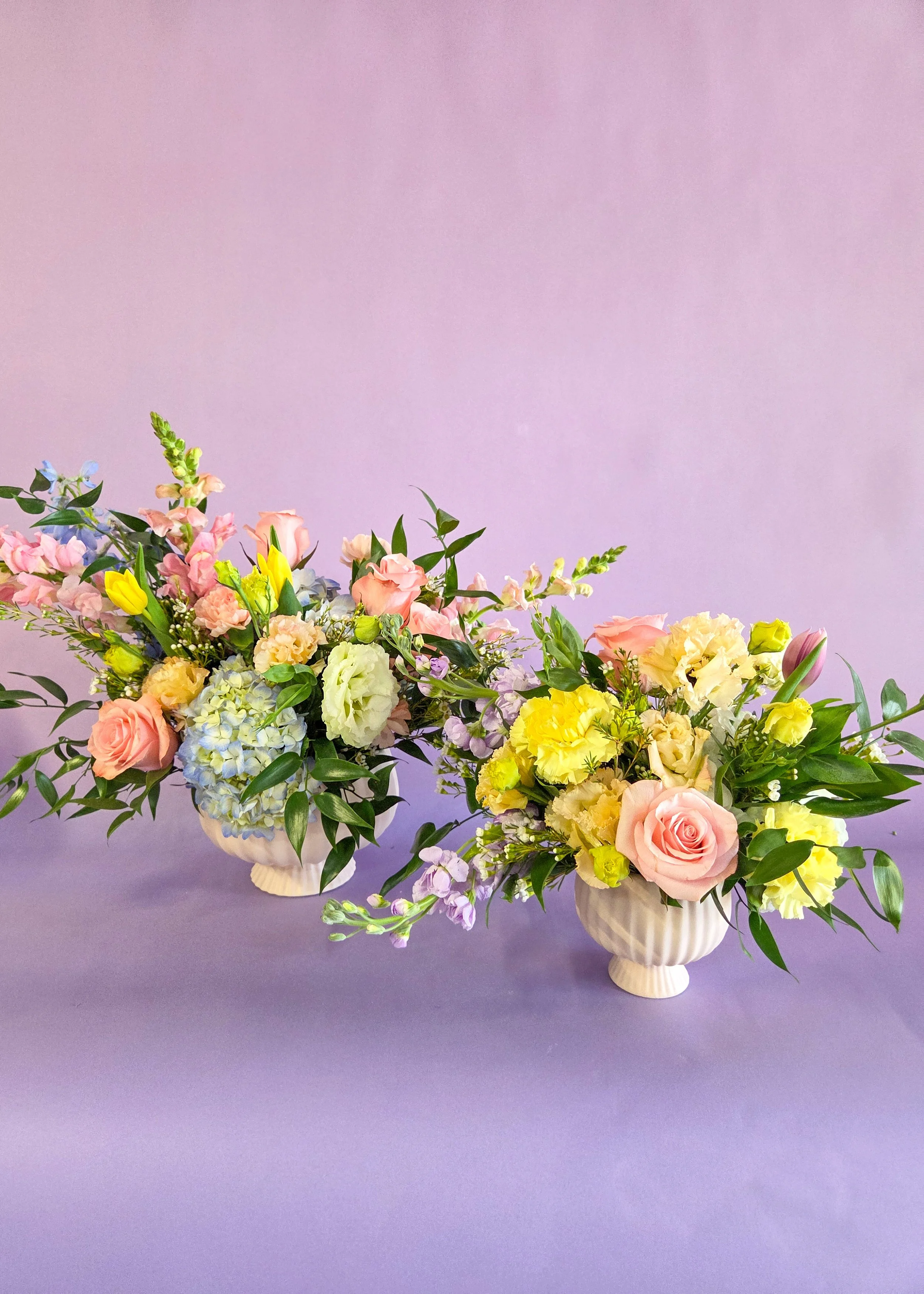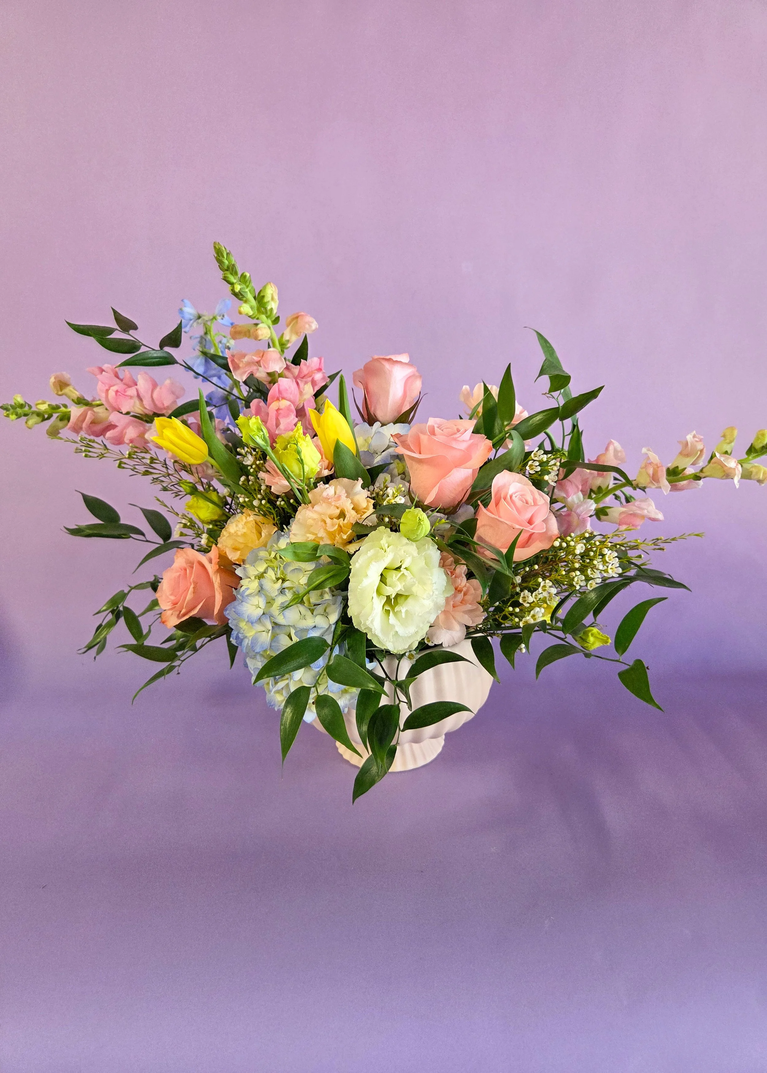 This year’s color palette is soft and joyful, with shades of pink, peach, light yellow, lavender, and sky blue. Each arrangement will include a curated mix of seasonal favorites such as roses, hydrangeas, carnations, tulips, ranunculus, lisianthus, snapdragons, delphinium, and wax flower.